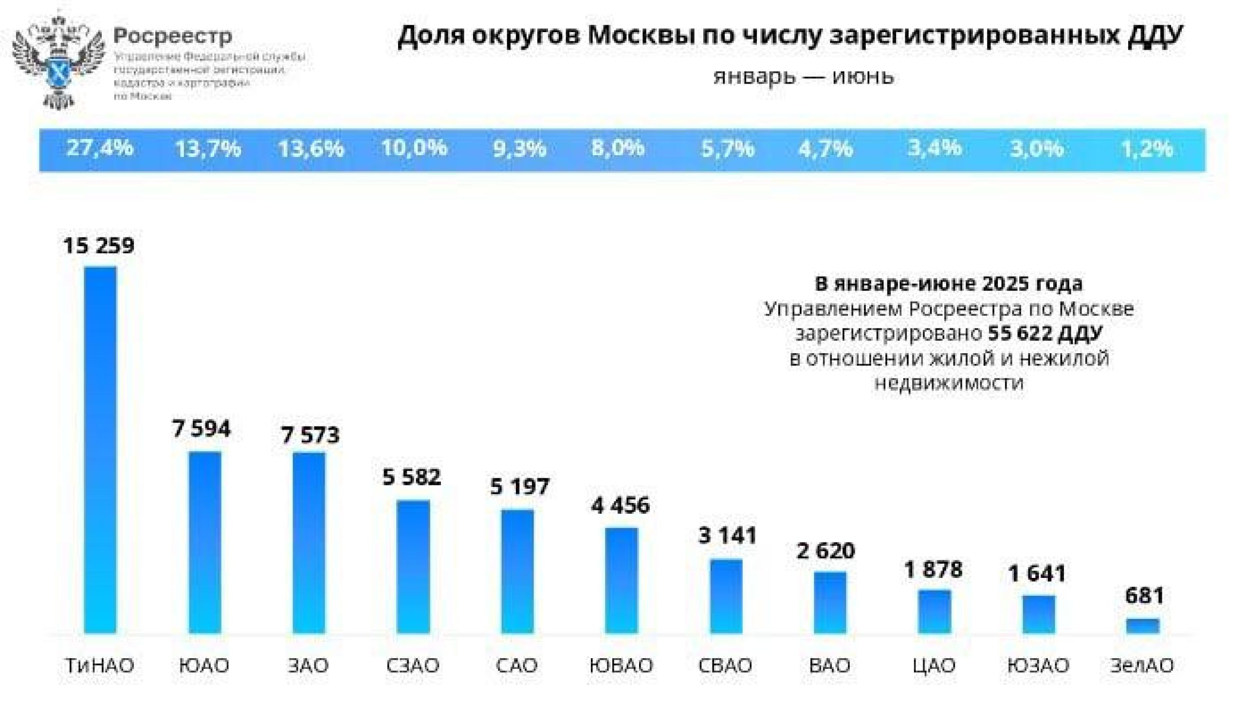 На втором месте по числу сделок — Южный административный округ с 7,59 тысячи ДДУ, что составляет 13,7%. Третье место с незначительным отставанием занял Западный округ — 7,57 тысячи договоров, или 13,6%. В сумме на эти три округа приходится более половины всех ДДУ в Москве — 54,7%.